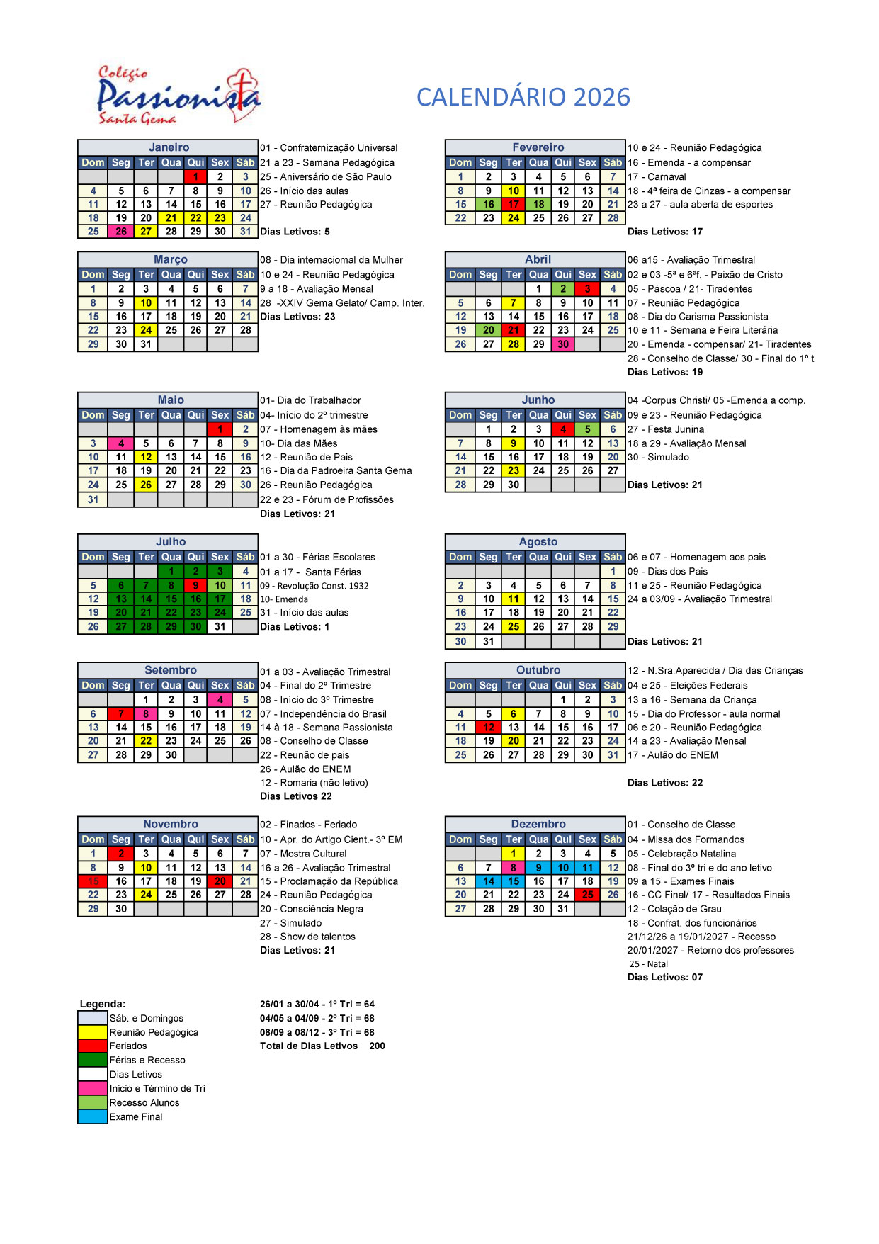 Calendário Escolar 2026 Santa Gema